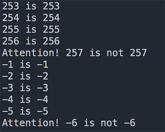 代码的执行结果如下图所示。可以看出代码第6行和第7行,也就是main函数中的257是从同一个位置加载的,因此是同一个对象;而代码第9行的a明显是从不同的地方加载的,因此引用的是不同的对象。
