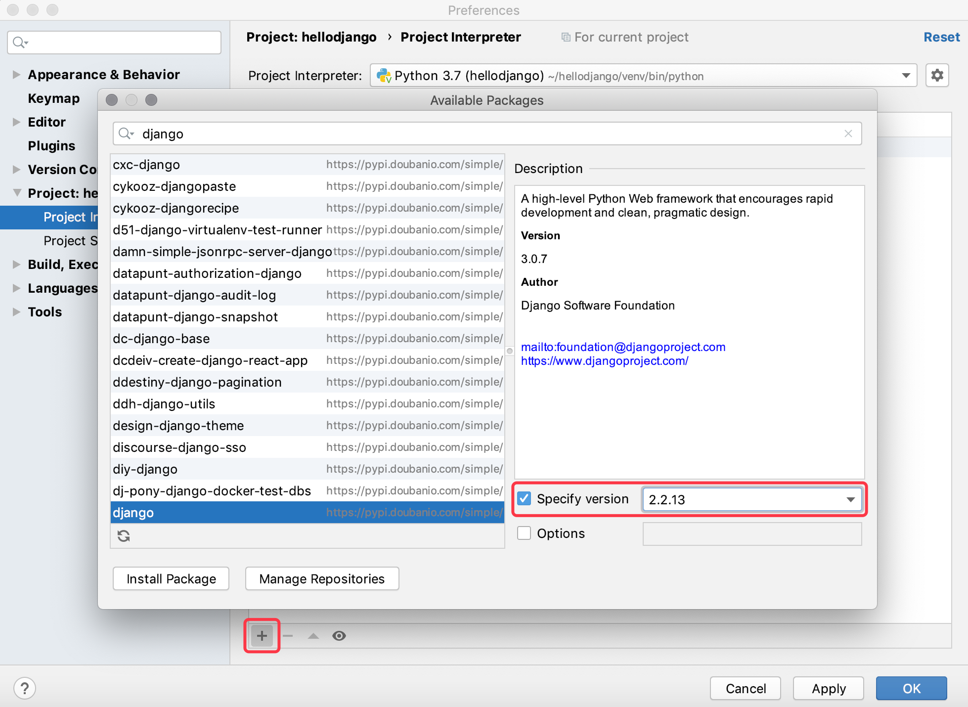 方法二:在PyCharm的偏好设置中,可以找到项目的解释器环境和已经安装的三方库,可以通过点击添加按钮来安装新的依赖项,需要提醒大家的是在安装Django依赖项时,需要指定版本号,否则将默认安装更新本文时最新的3.0.7版本。