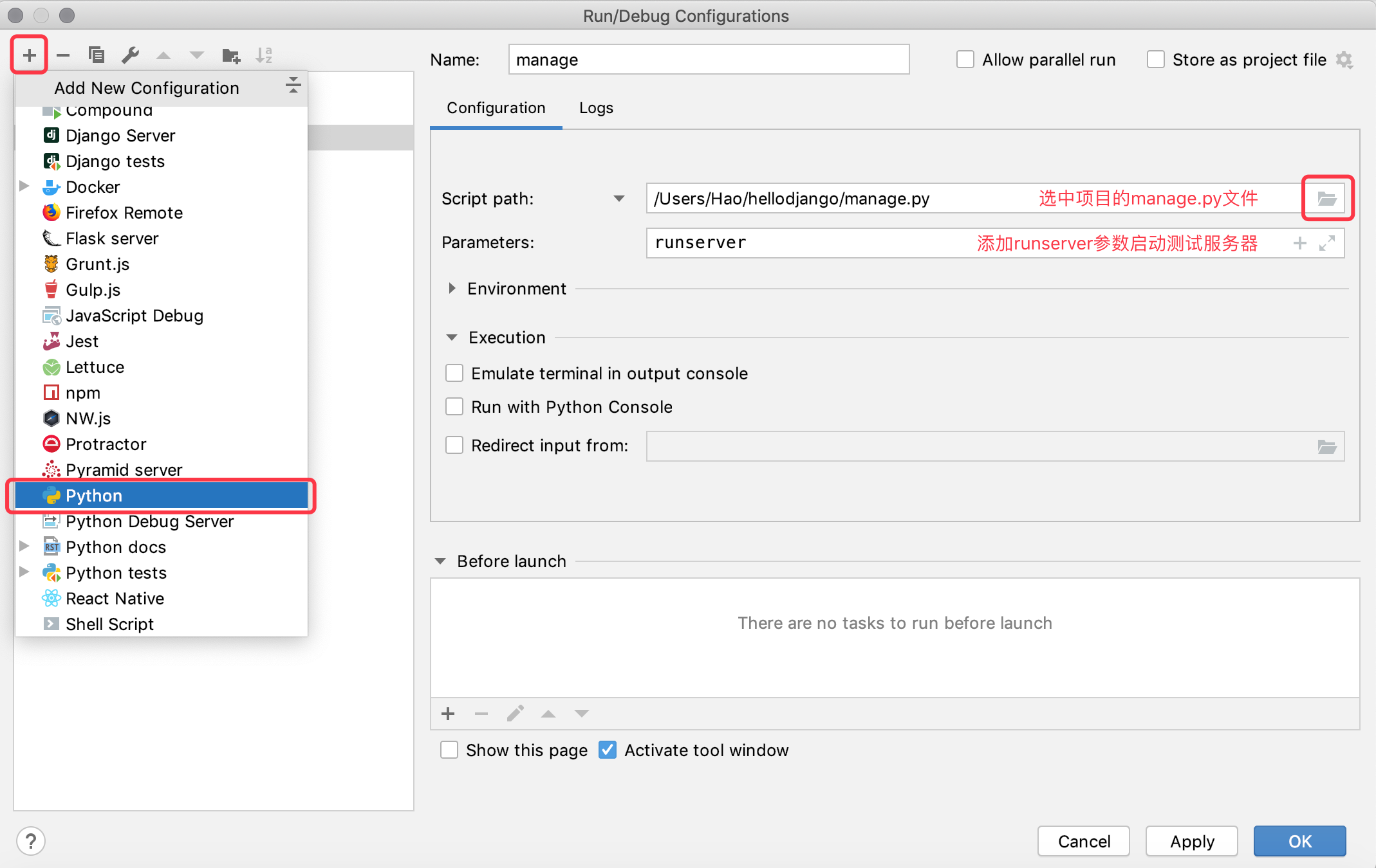 方法一:在“Run”菜单选择“Edit Configuration”,配置“Django server”运行项目(适用于专业版PyCharm)。