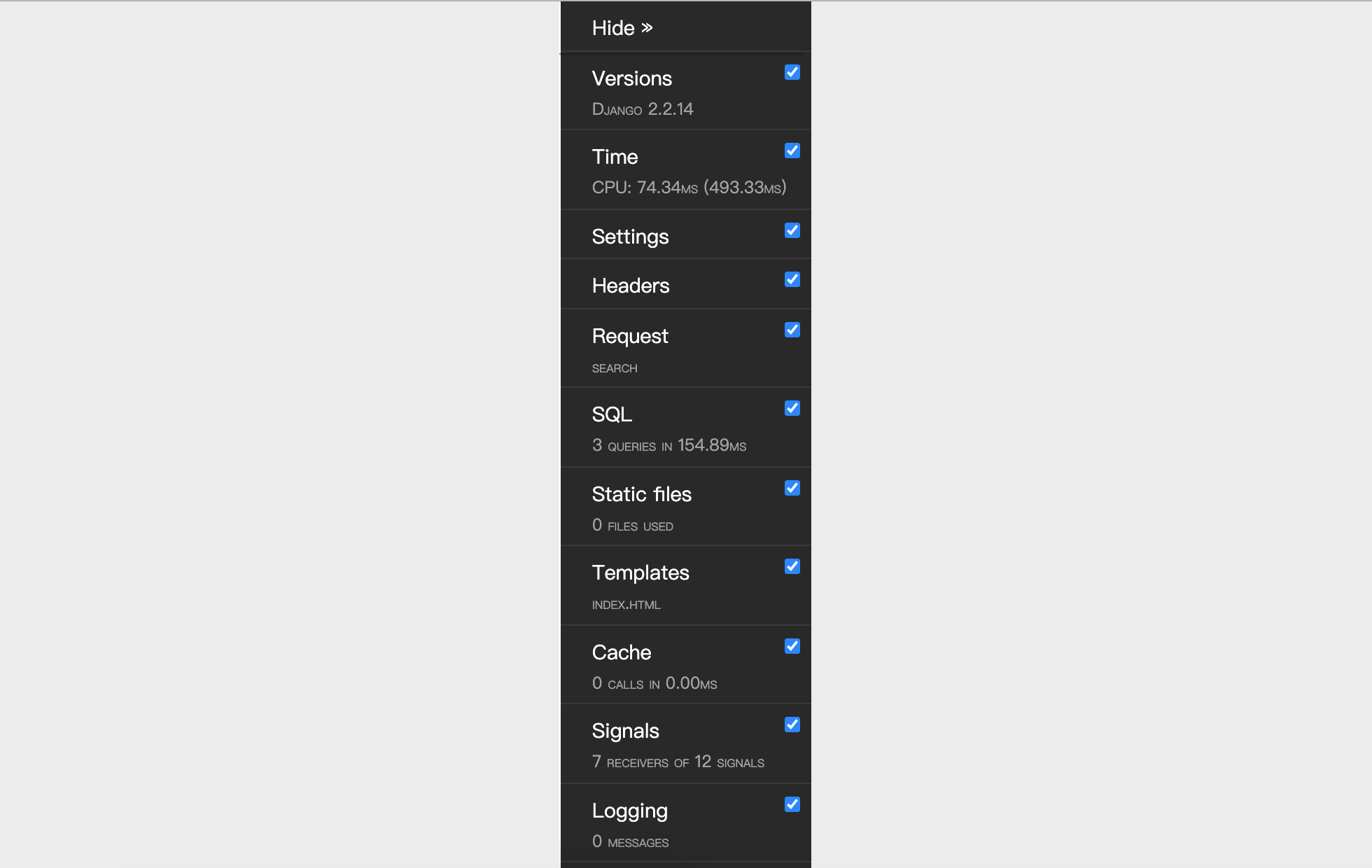 4. 在配置好Django-Debug-Toolbar之后,页面右侧会看到一个调试工具栏,如下图所示,上面包括了如前所述的各种调试信息,包括执行时间、项目设置、请求头、SQL、静态资源、模板、缓存、信号等,查看起来非常的方便。