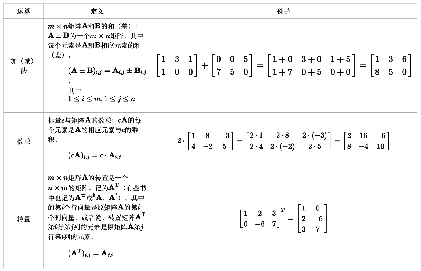 矩阵matrix)是由一系列元素排成的矩形阵列,矩阵里的元素可以是数字、符号或数学公式。矩阵可以进行加法减法数乘转置矩阵乘法等运算,如下图所示。