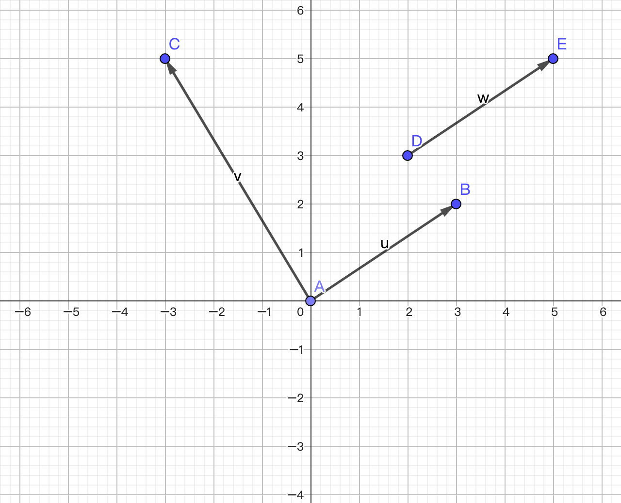 向量vector)也叫矢量,是一个同时具有大小和方向,且满足平行四边形法则的几何对象。与向量相对的概念叫标量数量,标量只有大小,绝大多数情况下没有方向。我们通常用带箭头的线段来表示向量,在平面直角坐标系中的向量如下图所示。需要注意的是,向量是表达大小和方向的量,并没有规定起点和终点,所以相同的向量可以画在任意位置,例如下图中$\boldsymbol{w}$和$\boldsymbol{v}$两个向量并没有什么区别。