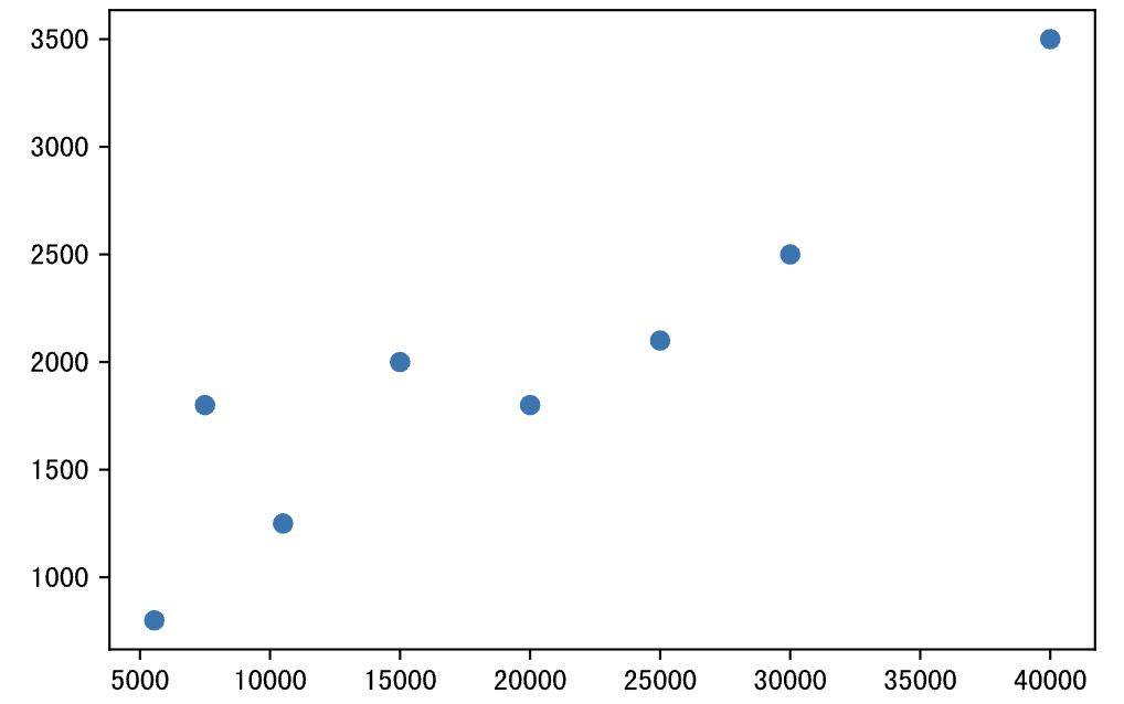 散点图可以帮助我们了解两个变量的关系,如果需要了解三个变量的关系,可以将散点图升级为气泡图。下面的代码中,xy两个数组分别表示每个月的收入和每个月网购的支出,如果我们想了解xy是否存在相关关系,就可以绘制如下所示的散点图。