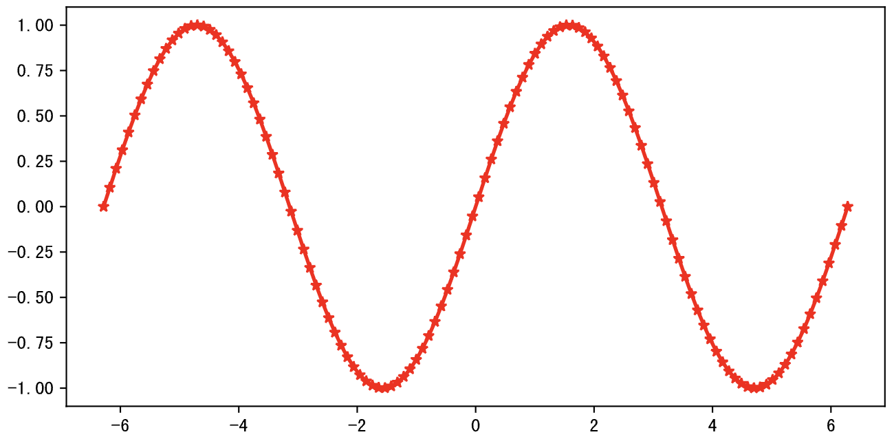在绘图时,如果没有先调用figure函数和subplot函数,我们将使用默认的画布和坐标系,如果要绘制折线图,可以使用pyplot模块的plot函数,并指定横轴和纵轴的数据。折线图最适合用来观察数据的趋势,尤其是当横坐标代表时间的情况下。我们可以使用plot函数的color参数来定制折线的颜色,可以使用marker参数来定制数据点的标记(例如:*表示五角星,^表示三角形,o表示小圆圈等),可以使用linestyle参数来定制折线的样式(例如:-表示实线,--表示虚线,:表示点线等),可以使用linewidth参数来定制折线的粗细。 下面的代码绘制了一条正弦曲线,其中marker='*'会将数据点的标记设置为五角星形状,而color='red'会将折线绘制为红色。
