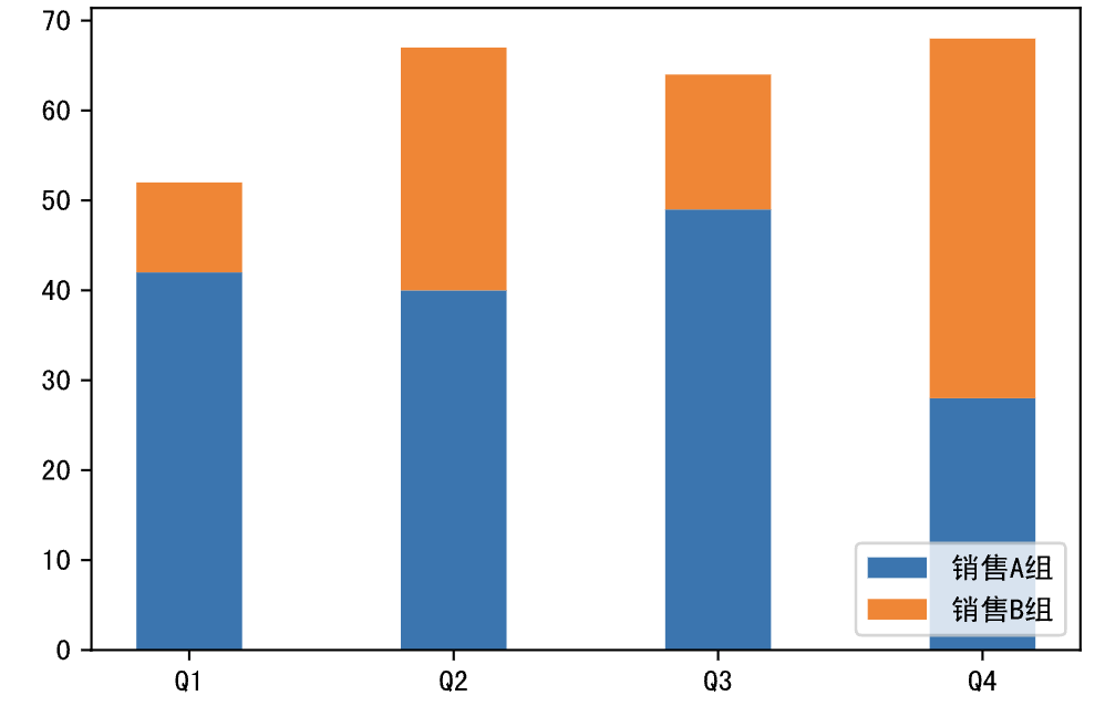 plt.bar(labels, y2, width=0.4, bottom=y1, label='销售B组')