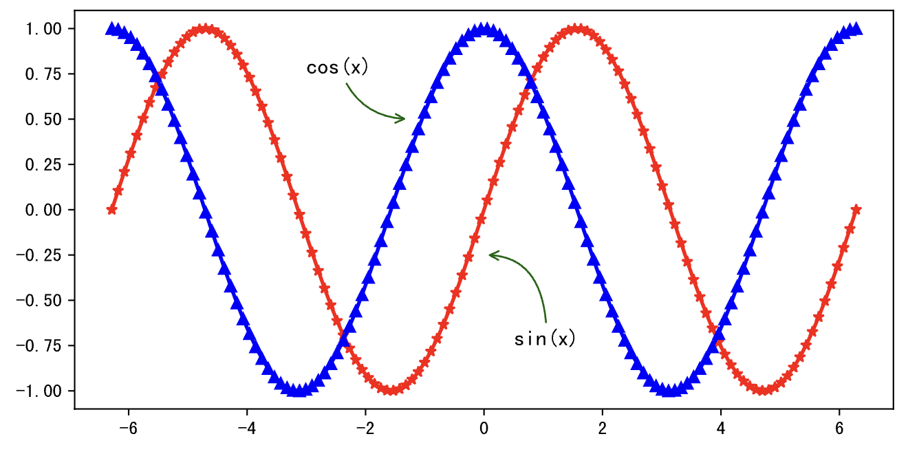 y1, y2 = np.sin(x), np.cos(x)